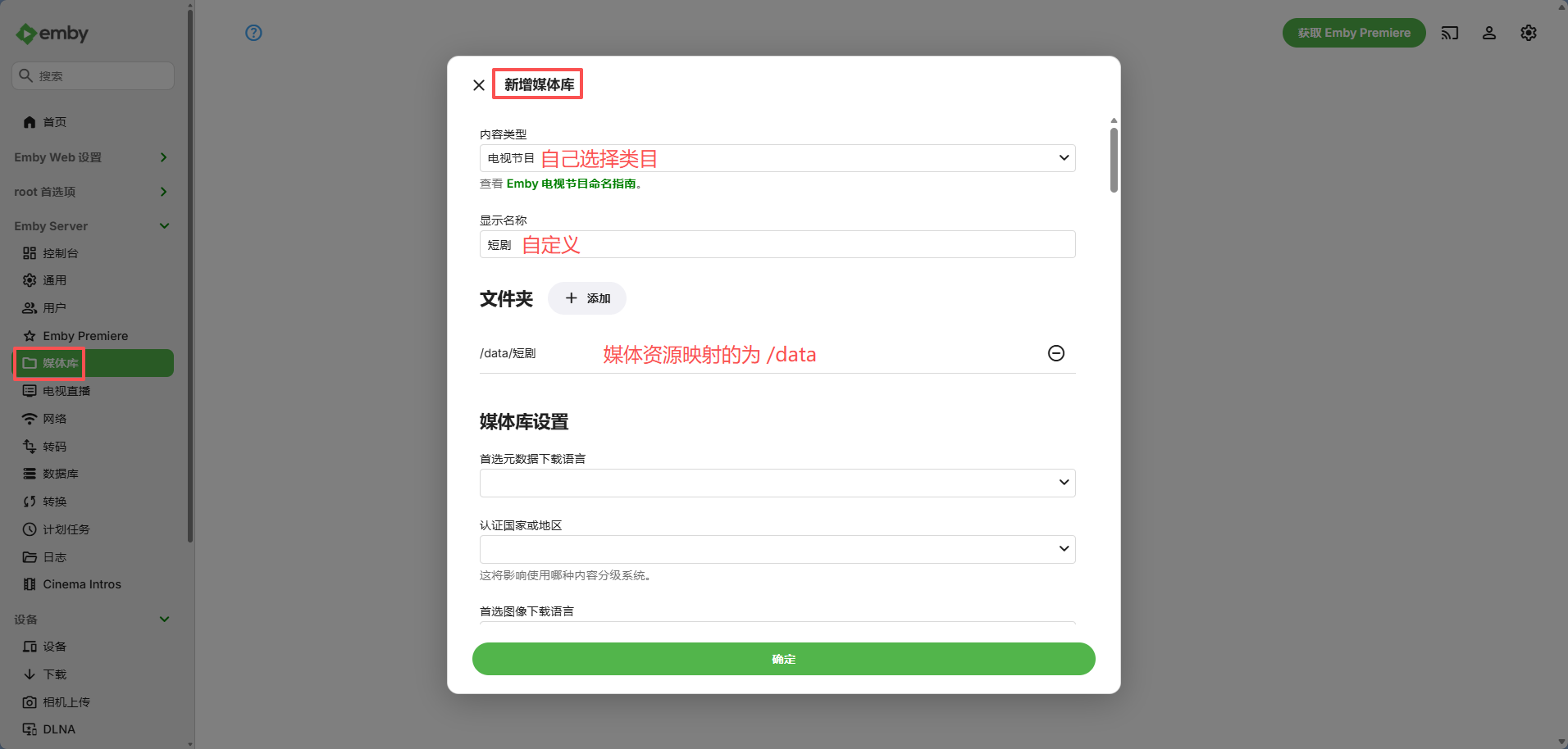 左侧栏选择“媒体库”选项,跳转到媒体库界面,选择“新增媒体库”,弹出配置窗口,按照自己的需求配置即可