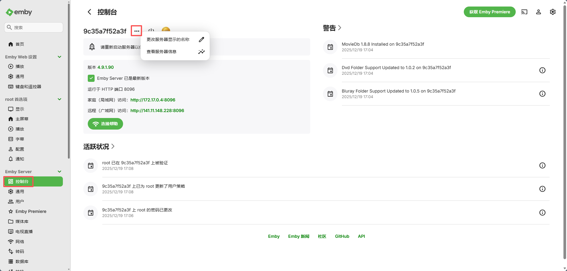 ## 保存即可并重启 Emby首页封面海报、外部媒体播放器调用、弹幕插件