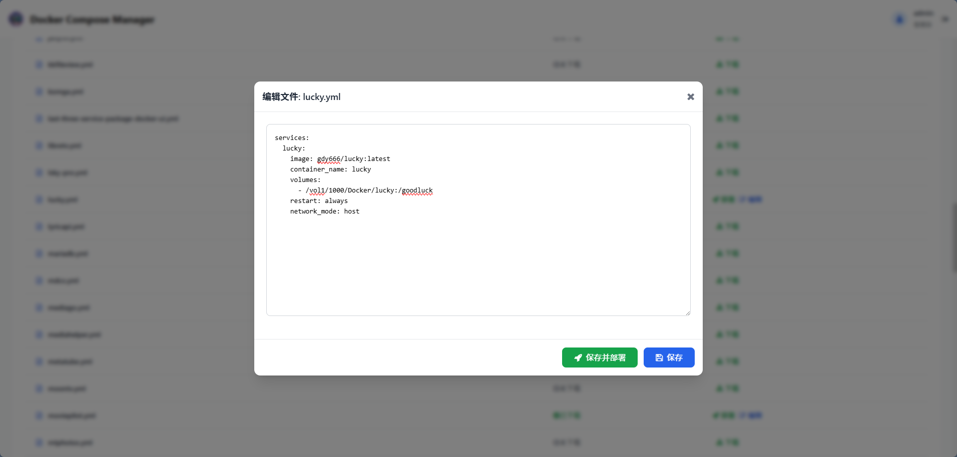 打开 Docker-Compose-Manager 的“获取 Gitee 拉取文件”界面,下载好 Lucky 的 yml 文件,点击“编辑”