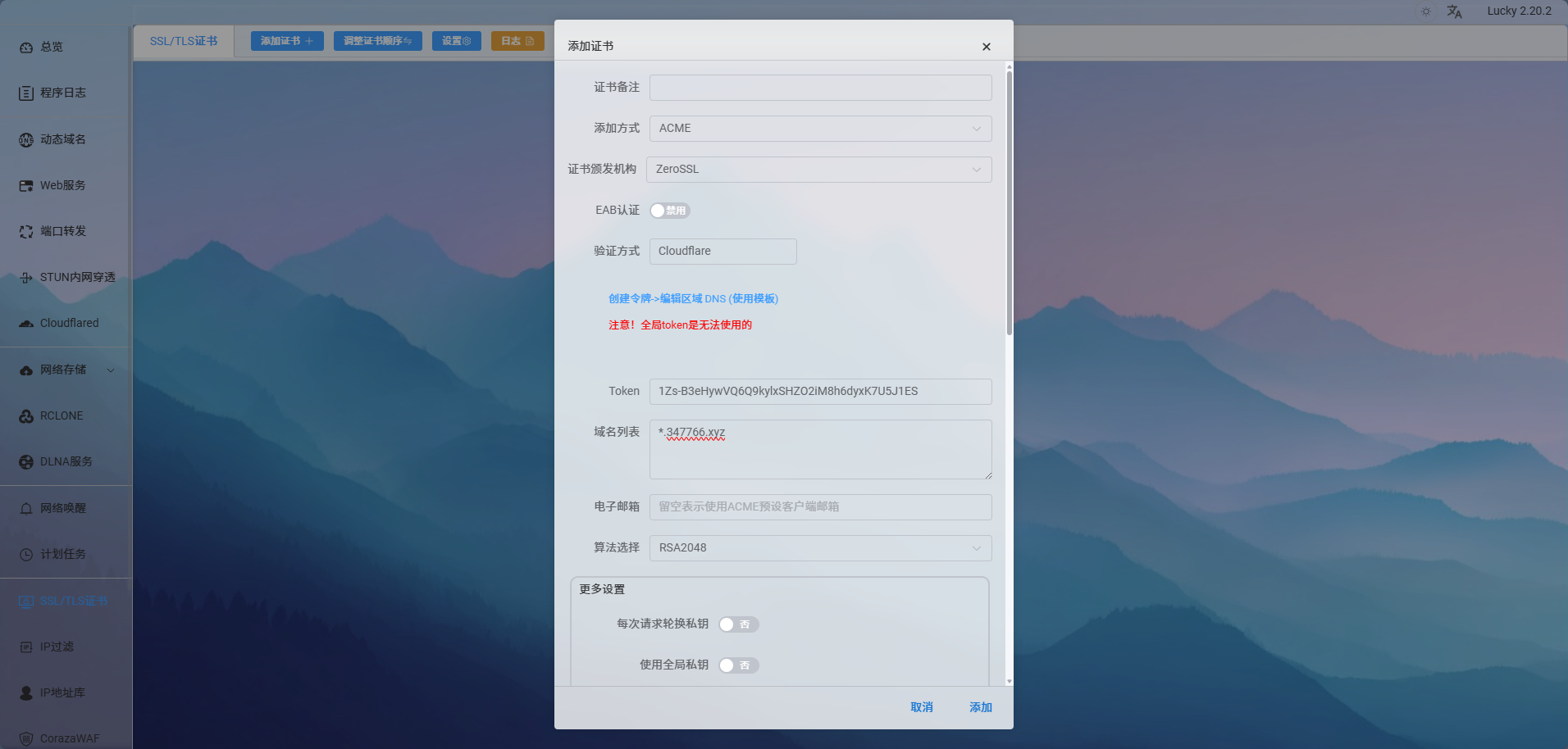 如果要开启 TLS 证书,点击左侧侧边栏“SSL/TSL证书”,来到SSL/TSL证书界面,点击“添加证书”,弹出配置窗口,添加方式选择“ACME”,验证方式选择“Cloudflare”,将 token 复制进来,域名填写泛域名即可,等待获取证书后,开启 TLS 即可