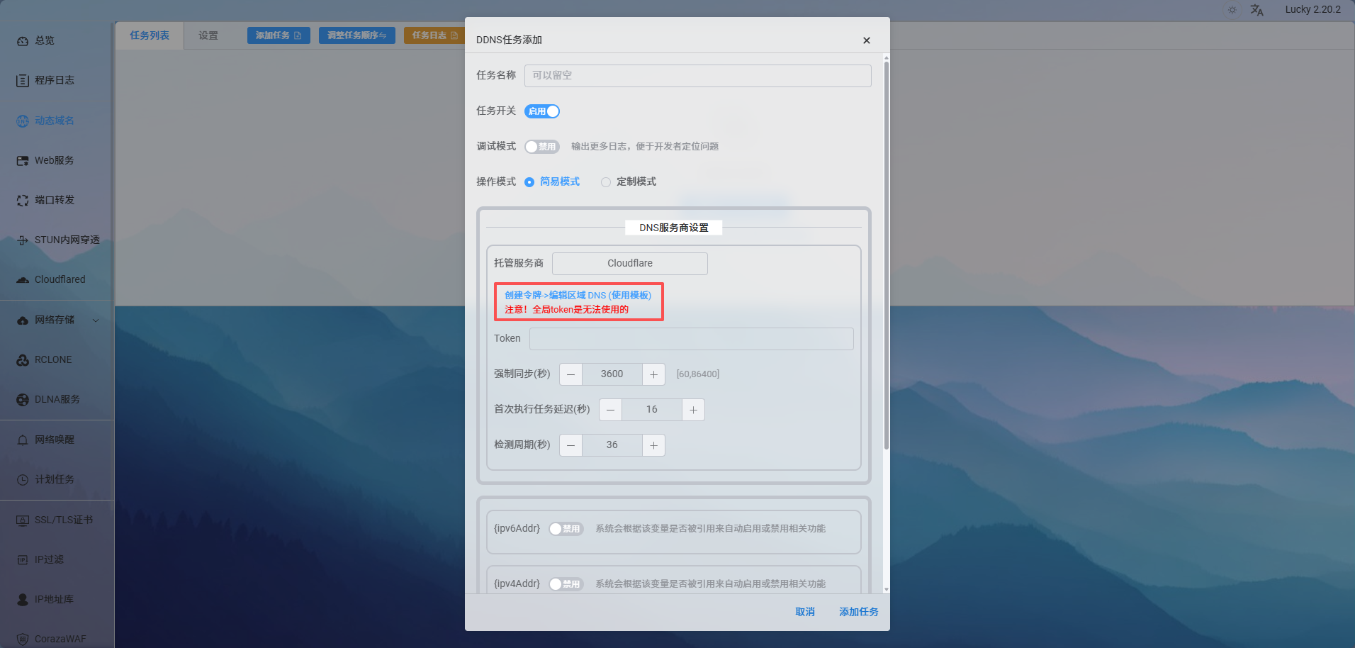 完成上述配置后,重新登录后,点击左侧侧边栏“动态域名”,来到动态域名界面,点击“添加任务”,弹出配置窗口,服务商选择“Clodflare”后,创建令牌