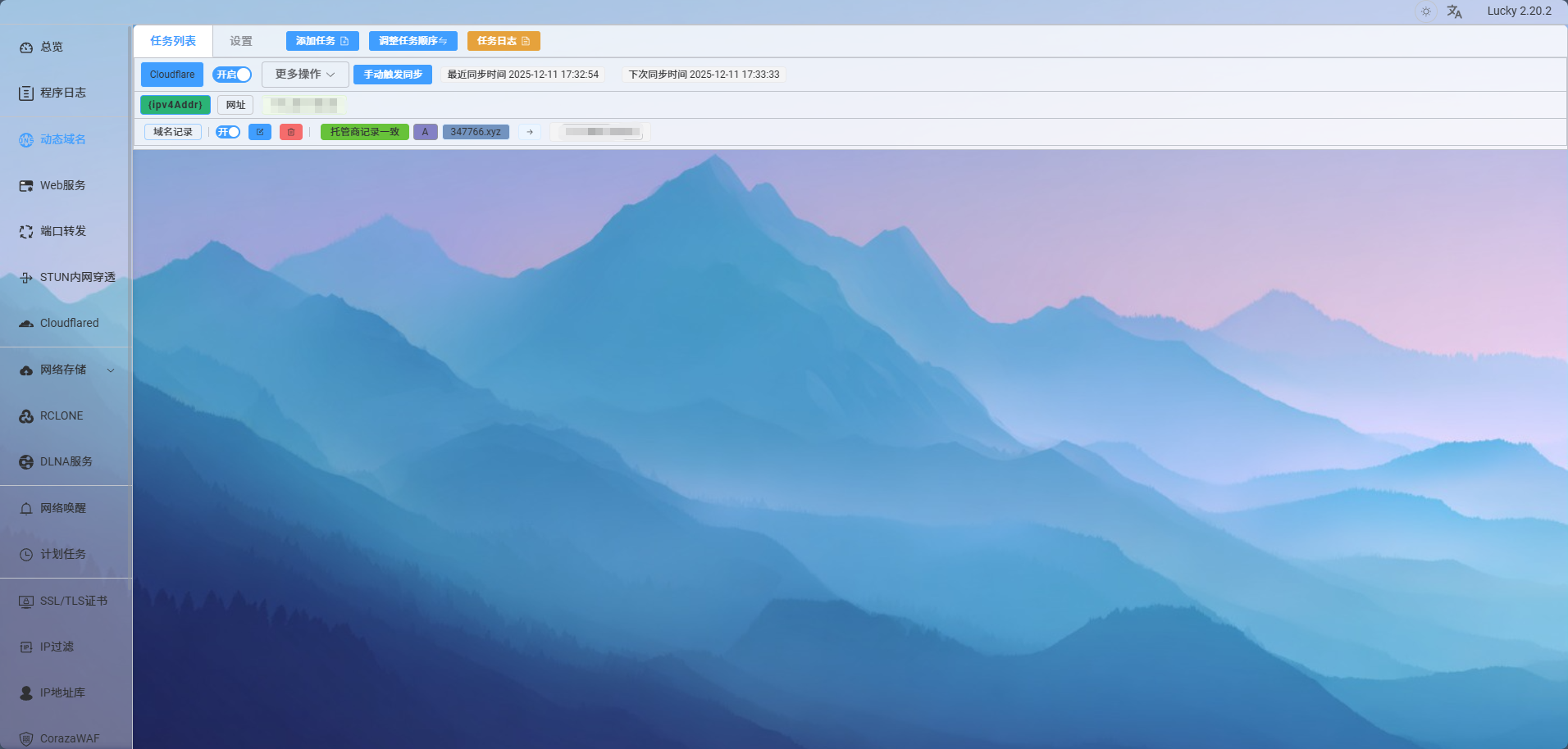 创建完成后,回到 Lucky 将 token 复制进去,开启 IPV4 或 IPV6 后,添加同步域名,填写完成后自动获取