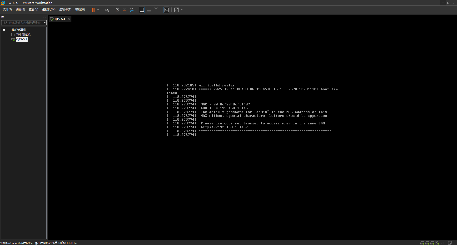 用“VMware”打开,下载好的虚拟机镜像“QTS-5.1.vmx文件”